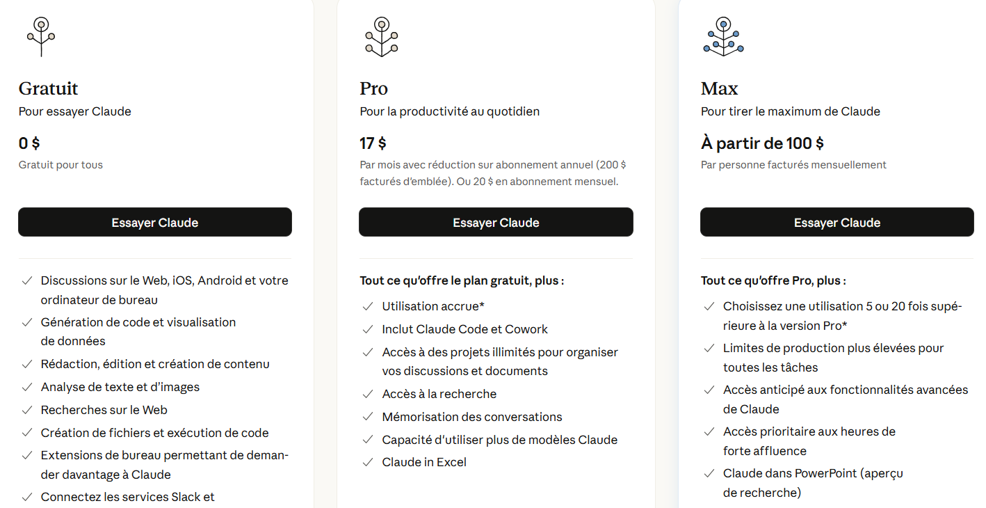 Claude Code est inclus dans les offres payantes de Claude : Pro et Max.