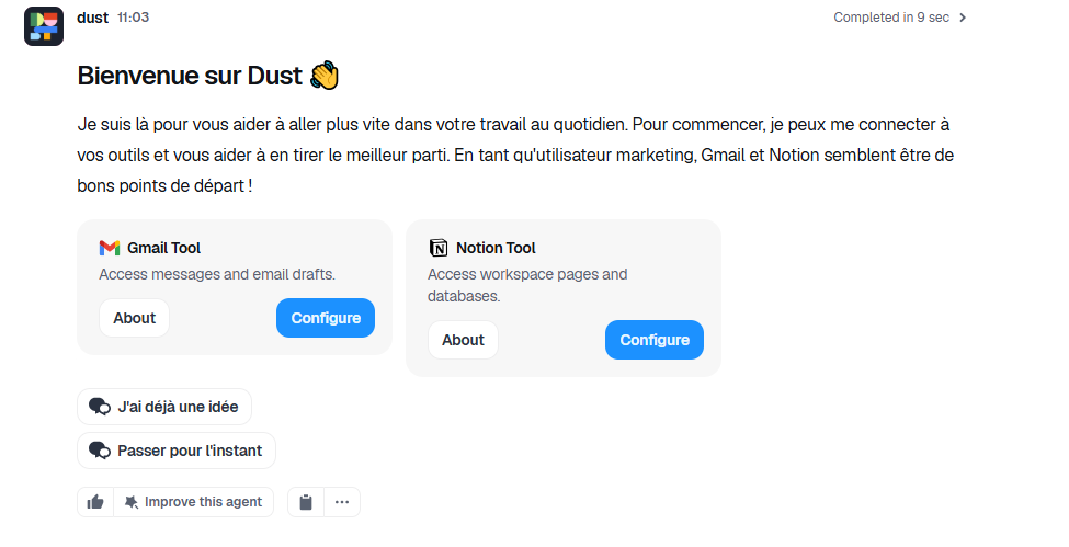 C’est là que Dust se distingue des autres outils IA. Il ne s'agit pas d'utiliser un chatbot généraliste. Il s'agit de construire une infrastructure IA qui connaît votre entreprise, parle votre langue, et travaille dans vos outils.