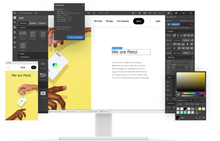 Webflow, en revanche, demande plus d’investissement. Son interface s’inspire des logiciels de design comme Figma ou Photoshop, avec une logique proche du code. Heureusement, les débutants disposent de nombreux templates Webflow prêts à l’emploi pour éviter de se sentir dépassés.