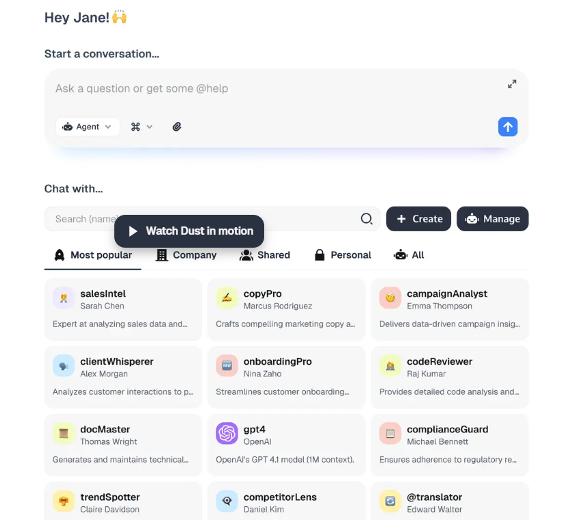 Lancée en 2022 par deux brillants entrepreneurs français, Stanislas Polu et Gabriel Hubert, Dust crée des agents virtuels sur mesure qui répondent avec pertinence à vos besoins spécifiques.