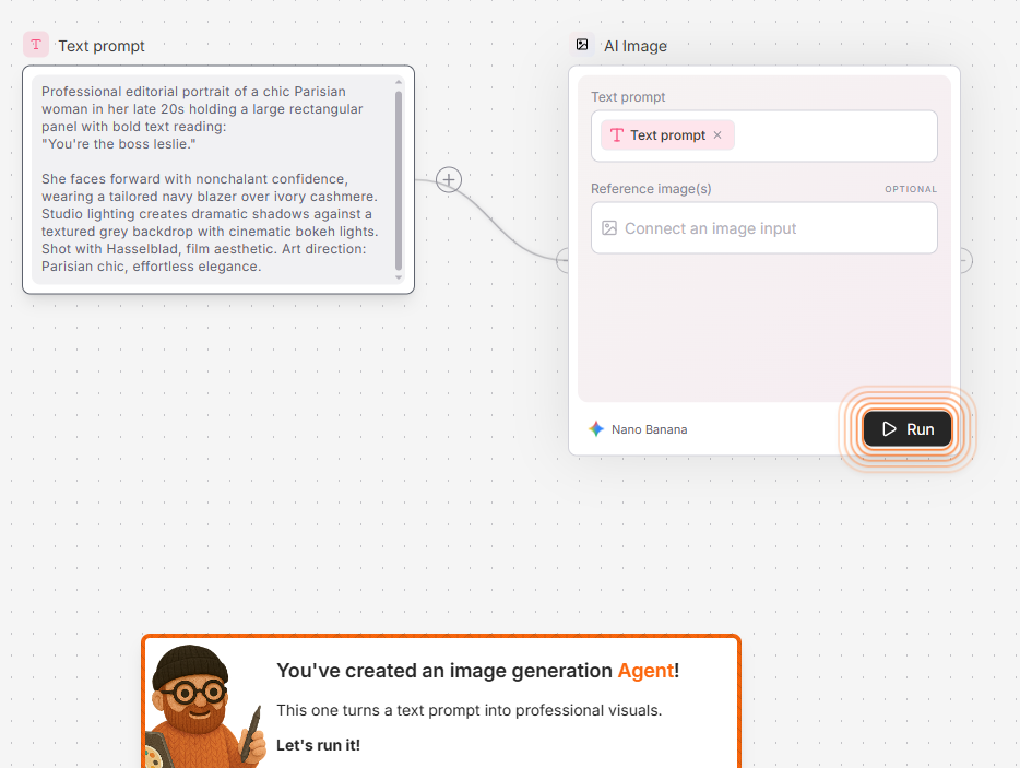 La logique d'agents partageables est aussi un vrai atout pour les équipes. Des équipes non techniques peuvent concevoir leurs propres agents IA pour créer du contenu marketing visuel, sans écrire de code complexe. Une fois l'agent configuré, n'importe quel membre de l'équipe peut l'utiliser comme une simple application.