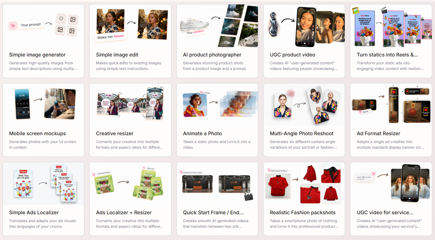 - Static to Motion Ads : transforme vos visuels statiques en contenus vidéo engageants.
